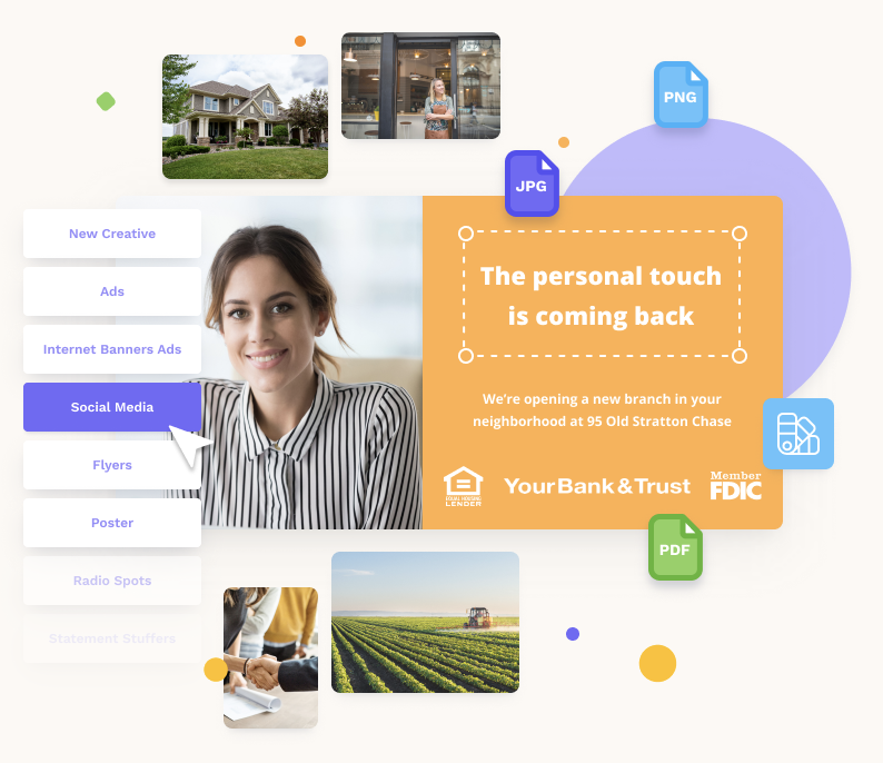 Customize bank marketing materials with your bank's logo, colors, and photos, all in a matter of seconds. Tailor content to your market while protecting your brand, without the expense of ad agencies or freelancers.
