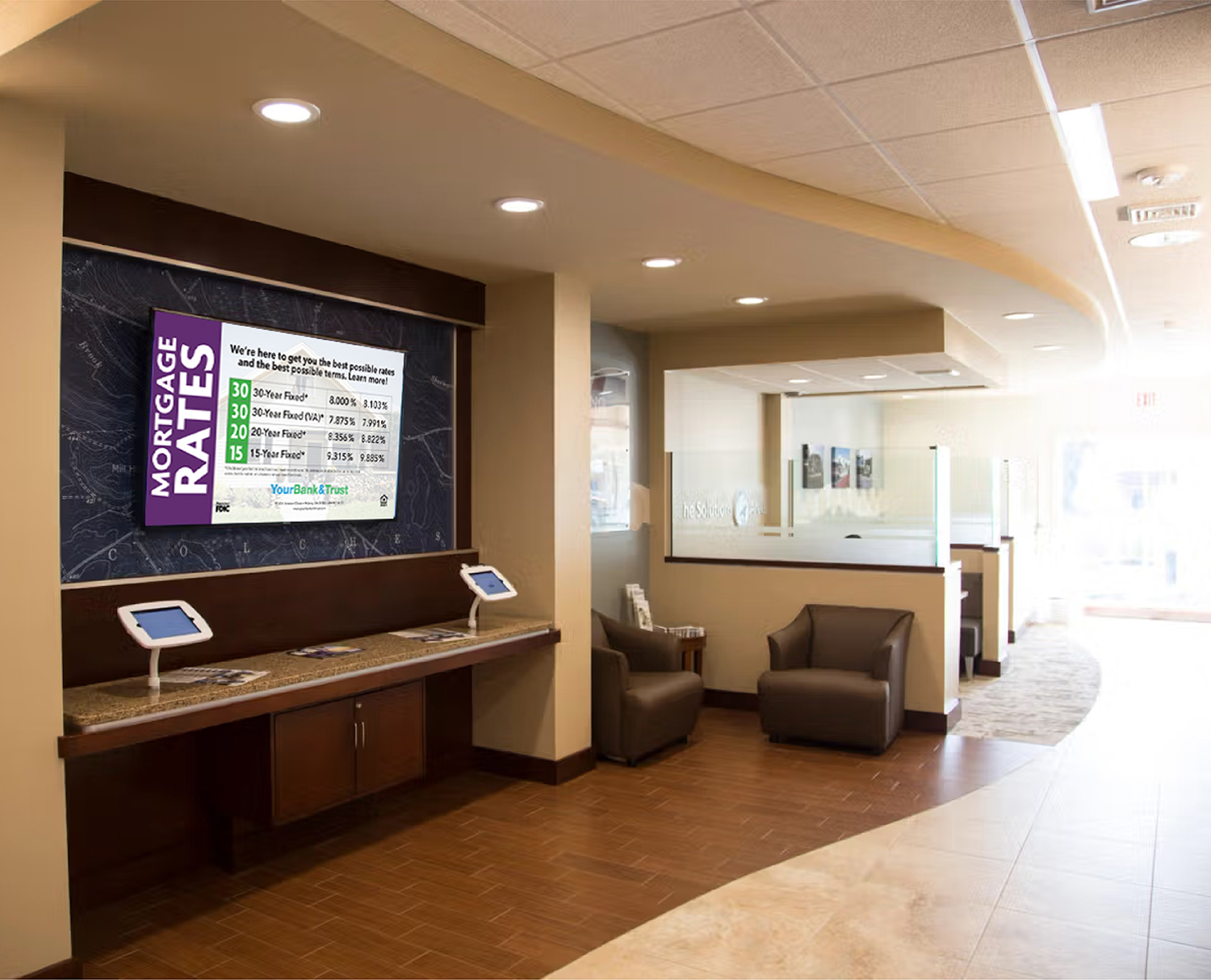 Yes! Successful banks are now discovering the many benefits of using digital signs to increase their deposits and profits. Professional graphics and videos grab customers’ attention without the high cost of printing posters, flyers and tent cards. Plus, banks are better equipped to cross-sell additional products.