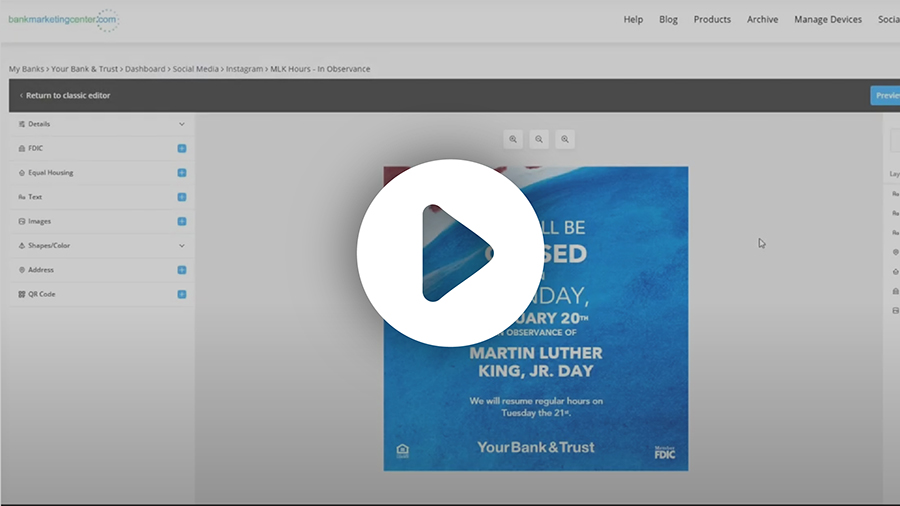 Now through its integration into our suite of services, Social+ gives your bank marketing team the power to manage their social media marketing more efficiently. That includes creating and deploying your observance and holiday hours messaging. Want to see our content creation tools in action?