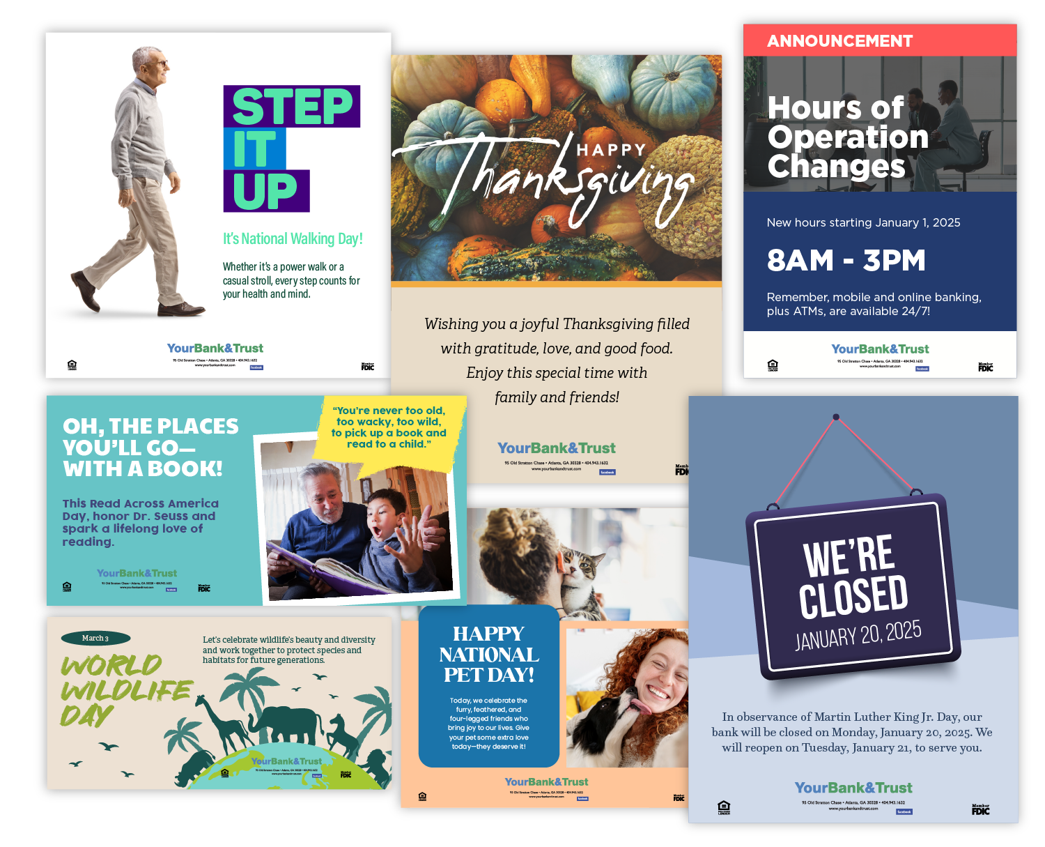 If, after searching our extensive content library, you can't find the perfect holiday observance, our bank marketing professionals are ready to assist. They'll create a custom design for you, ensuring that your holiday communication is both unique and in alignment with your brand identity.